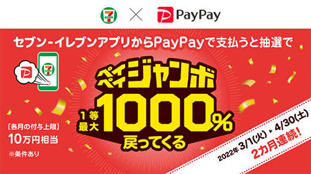PayPayは4月に複数の特定店舗を対象としたキャンペーンを開催中。まずは“セブン-イレブン”を対象にした「セブン-イレブンアプリで当たる!ペイペイジャンボ」。セブン-イレブンアプリを経由してPayPayで支払いをすると、抽選でくじが当たるキャンペーンで、1等で1000%、2等で10%、3等で1%が戻ってくる。還元上限は10万円相当/月。期間は4月30日まで。