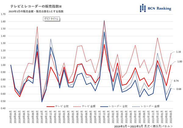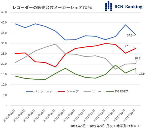 BD・HDDレコーダーの苦戦が続いている。昨年3月、販売金額前年比が100.9%を記録して以来、12カ月連続で販売台数、金額とも前年割れが継続。この3月の前年比は販売台数が76.3%、販売金額が77.1%。そろって2割以上の大幅な前年割れを喫している。回復基調にあるテレビとは対照的だ。全国家電量販店やネットショップなどの実売データを集計するBCNランキングで明らかになった。