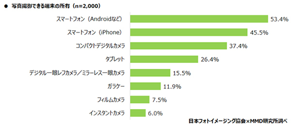 この調査は日本フォトイメージング協会とMMD研究所によって、2022年2月4日から2月7日にかけておこなわれた。15歳から69歳の男女2000人から回答を得ている。まずはがどのように写真撮影をおこなっているかについて見てみよう。大半の人がスマホを所有
