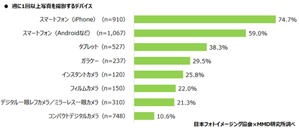 次に、週に1回以上写真を撮影するデバイスについて見てみよう。1位はiPhoneで74.7%、2位はAndroidなどのスマホで59.0%となっている。やはりスマホを日常的な写真撮影デバイスとして使っている人が多いことがわかった。