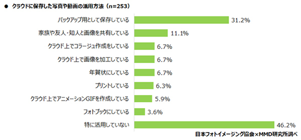 一方、クラウドの活用方法としては「特に活用していない」が最も回答数が多く46.2%、次いでバックアップ用として保存している人が31.2%となっている。