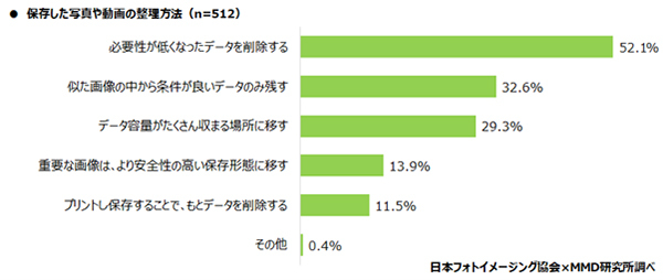 スマホの内蔵ストレージが容量オーバーになるのを防ぐ方法としては、必要性が低くなったデータを削除する人が52.1%と過半数だった。フィルムのような消耗品の購入が必要ないスマホでは、気軽に撮影して気軽に消す方法が広くとられていることがわかる。