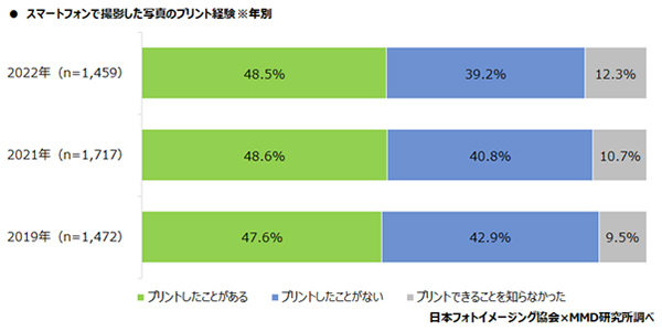 スマホで撮影した写真を印刷するかどうかについての調査では、約半数が印刷したことがあると回答した。2019年に比べて印刷したことがある人が微増した一方、印刷できることを知らなかった人が増えている。