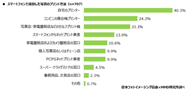 スマホ写真のプリント方法については、自宅のプリンタが40.3%と一番人気であった。フィルム写真時代には当たり前だった個人写真店やチェーン店はわずか9.9%と、高性能な家庭用プリンタが普及して手軽にきれいな写真プリントができるようになったことが原因と考えられる。
