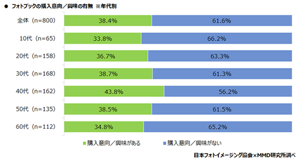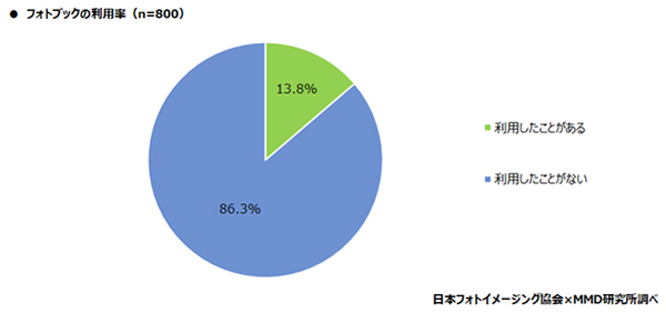 オリジナルの写真集を作る「フォトブック」については、利用したことがある人はわずか13.8%だった。フォトブックに興味があるかどうかのアンケートでは、40代で興味がある人が突出して多い。また、30代と50代も40代に次いで興味がある人が多く、これらの年代の人は写真を印刷して残したいと考えている割合が多いようだ。