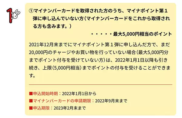 総務省の「マイナポイント事業」第1弾に続き、2022年1月1日から第2弾がスタートした。現状は三つの対象のうち、最大5000円相当のキャッシュレス還元分のみがもらえる。対象者は2022年9月末までにマイナンバーカードを申請した人。