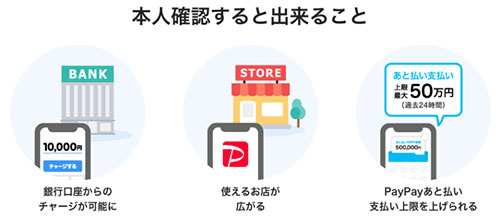 本人確認をすると、銀行口座からPayPay残高へのチャージ、PayPayマネーの利用、利用可能店舗の拡大、「PayPayあと払い」の利用額の上限アップなどの利点がある。
