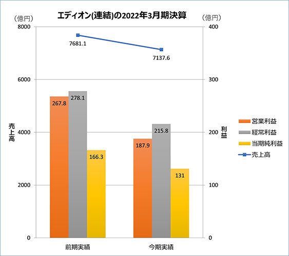 エディオンの22年3月連結決算は、売上高が7137億6800万円(前期比7.1%減)、営業利益は187億9600万円(同29.8%減)、経常利益は215億8900万円(同22.4%減)で、親会社株主に帰属する当期純利益(以下、当期純利益)は131億900万円(同21.2%減)と減収減益だった。21年度を振り返ると、期初の4~5月にかけては新型コロナウイルスの第4波で4都道府県に緊急事態宣言が発令。93店舗が休業を余儀なくされた。6~8月にかけては西日本を中心とした長梅雨や豪雨がエアコンに代表される季節商品の需要にマイナスとなった。