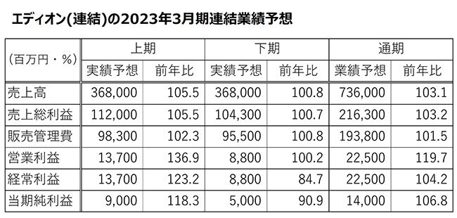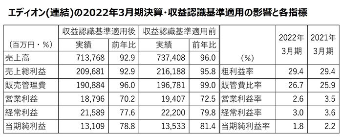 エディオンの2022年3月期連結決算が発表された。同期は前期に発生したテレワーク需要や巣ごもり需要の反動減が生じ、さらに天候不順や新型コロナウイルス拡大による店舗の休業等の影響によって減収減益となったが、売上総利益率はほぼ横ばいをキープした。