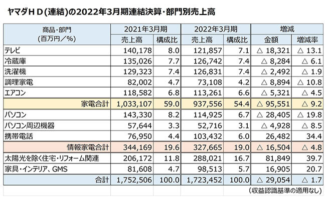 ヤマダHDの事業はデンキ、住建、金融、環境、その他の五つのセグメントで構成されている。22年3月期の住建、金融、環境は増収だったが、事業の核で連結売上高の約8割を占めているデンキは前年度比14.5%の減収だった。収益認識基準適用前の商品・部門別売上高を表したのが次の表である。