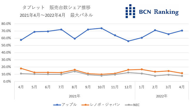 全国の家電量販店やECショップでPOSデータを集計する「BCNランキング」によると、2022年4月のタブレット端末の販売台数は前年同月比106.0%と伸びを示した。21年後半は巣ごもり特需の反動で前年を下回る月が続いていたが、今年に入ってからは回復基調を維持している。