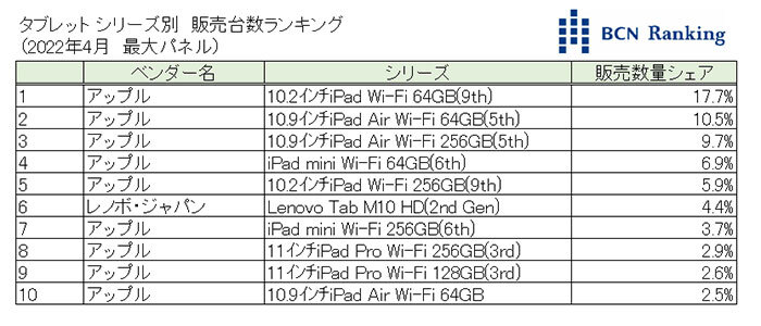 シリーズ別の販売台数シェアランキングでは、トップテンの内で9シリーズをiPadが占めた。首位は「10.2インチiPad Wi-Fi 64GB(第9世代)」。「10.9インチiPad Air Wi-Fi 64GB」「10.9インチiPad Air Wi-Fi 256GB」が続く。iPad以外では「Lenovo Tab M10 HD(2nd Gen)」が6位にランクインしている。(BCN・大蔵 大輔)