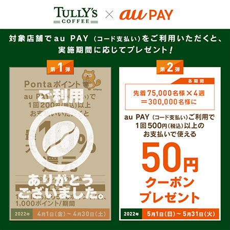 au PAYは4月1日からタリーズコーヒーでキャンペーンを開催中。現在は第2弾が行われている。毎週先着7万5000人に税込500円の買い物で使える50円クーポンを配布するというもので、期間は5月31日まで。よくタリーズを利用するというユーザーはぜひゲットしておこう。
