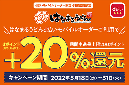 d払いは5月18日からはなまるうどんで20%還元キャンペーンを開催している。キャンペーンの対象となるのは、d払いのモバイルオーダーでテイクアウトを利用したユーザー。決済金額の20%分のdポイントが還元される。還元上限は200ポイント。期間は5月31日まで。