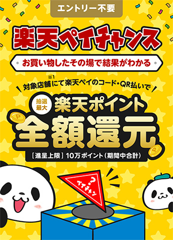 楽天ペイが5月1日から開催している「楽天ペイチャンス」は5月31日に終了する。対象店舗で楽天ペイを利用すると抽選に参加することができ、1等は100%、2等は50%、3等は1%を還元する。還元上限は10万ポイント/期間。