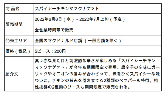 マクドナルドが人気メニュー「スパイシーチキンマックナゲット」を、6月8日に期間限定で発売した。チキンの旨みが引き立つ期間限定ソース(3種の唐辛子ソース、爽快レモンタルタルソース)も新登場している。