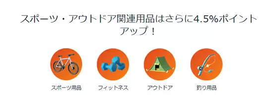 さらに、スポーツ・アウトドア関連用品は4.5%のポイントアップとなり最大10%のポイント還元率となる。4.5%の対象は「スポーツ用品」「フィットネス」「アウトドア」「釣り用品」となる。梅雨の巣ごもり中のフィットネスから夏のキャンプ用品まで、お得な「タイムセール祭り」を活用したい。