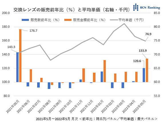 交換レンズ市場が「コロナ明け」を迎えた。カメラ市場に先んじて回復の動きはあったが、この4月と5月は連続して販売本数・金額がそろって前年比増を維持している。特に5月は本数前年比で120.6%、金額で133.9%を記録。税抜き平均単価(以下同)も7万5000円前後まで上昇してきた。ここに来て本格的な回復期を迎えつつある。全国の家電量販店やカメラ専門店、ネットショップなどのPOSデータを集計するBCNランキングで明らかになった。