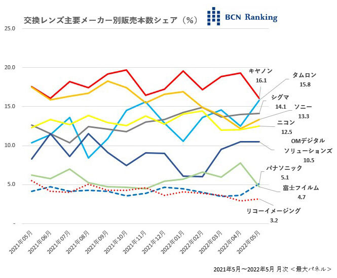 メーカー別のシェアもこのところ大きく変動している。5月のトップは16.1%のキヤノンだが、2位に15.8%とタムロンが僅差で迫っている。同じくレンズメーカーのシグマが14.1%で3位。若干シェアを落としてきたものの、ソニーが13.3%で4位、ニコンが12.5%で5位と続く。わずか4ポイント足らずで5社がひしめく大混戦。一時シェアを落としていたOMデジタルソリューションズも4月、5月と2桁シェアを回復しており、6社でシェアを取り合う様相だ。