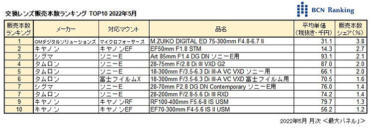 売れ筋の特長は、高価格モデルがランキング上位に来ていること。5月、販売本数1位はOMデジタルソリューションズの「M.ZUIKO DIGITAL ED 75-300mm F4.8-6.7 II」(3万円台前半)、2位はキヤノンの「EF50mm F1.8 STM」(1万円台半ば)と、トップ2は比較的安めのモデル。しかし3位はシグマの「Art 85mm F1.4 DG DN ソニーE用」。高級レンズのArtシリーズで平均単価は9万円台前半。4位もタムロンの「28-75mm F/2.8 Di III VXD G2」でこちらも9万円台前半の製品だ。こうした高価格帯製品の好調も、レンズ市場の回復に寄与している。(BCN・道越一郎)