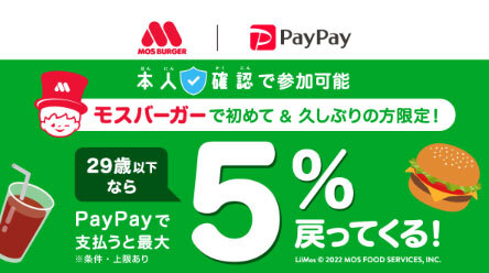 8月のキャンペーンもすでに発表されている。「モスバーガーでPayPay決済が初めて&久しぶりの方限定!U29なら最大5%戻ってくるキャンペーン」だ。7月26日までに本人確認申請を済ませていると参加でき、1992年1月1日以降に生まれたユーザーが対象になる。PayPay決済でモスバーガーを初めて、もしくは2022年3月以降の決済がない場合に5%を還元する。期間は8月31日まで。