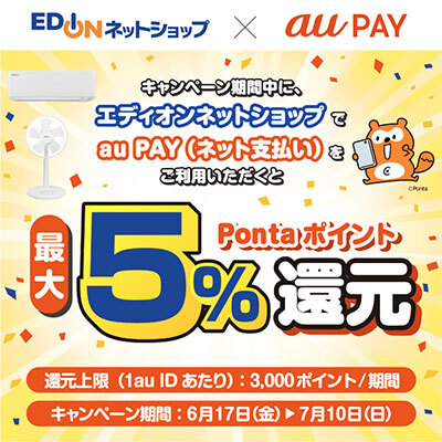 au PAYは6月17日からエディオンネットショップでキャンペーンを開催中。au PAY(ネット支払い)で1回200円(税込)以上決済すると、Pontaポイントを最大5%を還元する。還元上限は1au IDあたり3000ポイント/期間。期間は7月10日まで。