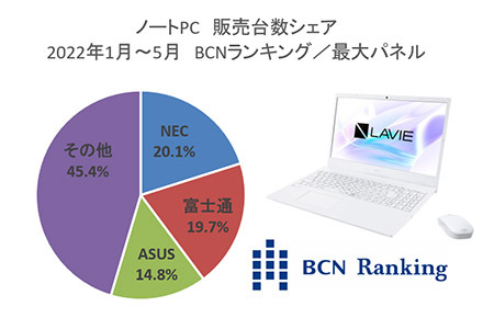 テレワークの主役として再び脚光を浴びているノートPC部門。今年はいつになくメーカーのシェア争いが熾烈になっている。トップは絶対王者のNECパーソナルコンピュータで販売台数シェアは20.1%。これを追うのが富士通クライアントコンピューティングなのだが、シェアは19.7%と0.4ポイント差で肉薄している。