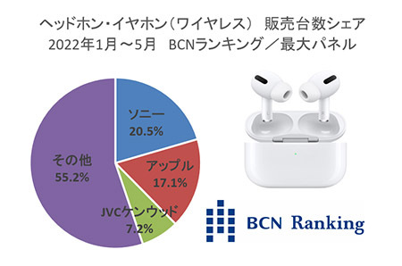 完全ワイヤレスイヤホンの普及で活況が続いているのが、ヘッドホン・イヤホン(ワイヤレス)部門。アップルのAirPodsシリーズが目立ちがちだが、実は5月時点で今年のメーカー別トップシェアをマークしているのは、ソニー。販売台数シェアは20.5%でアップルとは3.4ポイント差。完全ワイヤレスイヤホンだけでなく、ワイヤレスヘッドホンでも幅広いラインアップを揃えており、販売を伸ばした。