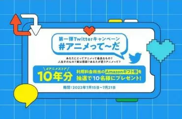 第1弾としては、7月15日~21日23時59分の期間に、「dアニメストア」の公式Twitterアカウントをフォローして、ハッシュタグ「#アニメって~だ」を付けてエピソードをツイートすると、抽選で10名に「dアニメストア」10年分の料金に相当するAmazonギフトをプレゼントするTwitterキャンペーンを行う。