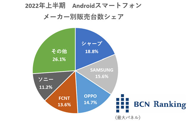 家電量販店の実売データを集計した「BCNランキング」によると、2022年上半期(1月~6月)にAndroidスマートフォン(ベースOS別Android OS搭載スマホ)でメーカー別販売台数1位は2021年に引き続きシャープが獲得した。これで5年半連続1位となった。販売台数シェアは18.8%。これまでに発売した「sense」シリーズに加え、新シリーズ「wish」が好調で、No.1獲得の原動力となった。