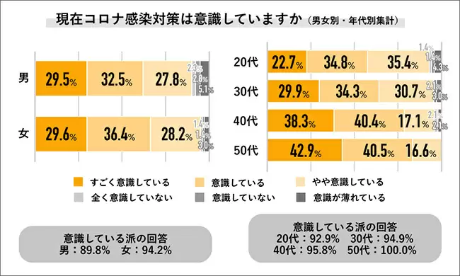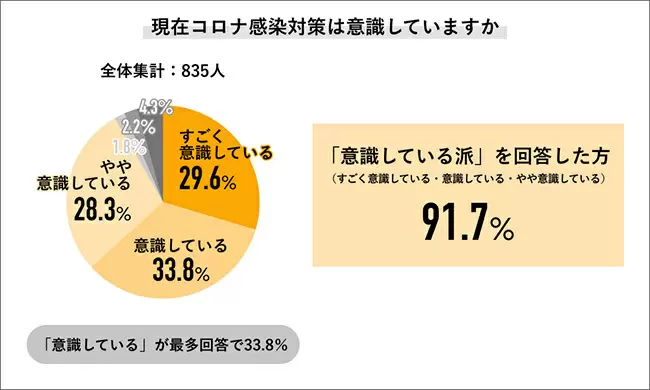 調査対象者に、新型コロナウイルス感染症対策を意識しているかを尋ねたところ、「すごく意識している」(29.6%)、「意識している」(33.8%)、「やや意識している」(28.3%)を合わせた割合である“意識している派”は91.7%に達した。