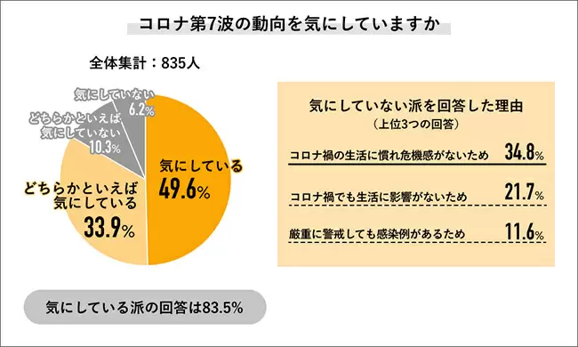 新型コロナの第7波について動向を気にしているかを尋ねた質問では、「気にしている」(49.6%)と「どちらかといえば気にしている」(33.9%)を合わせた“気にしている派”が83.5%となり、“気にしていない派”は16.5%だった。