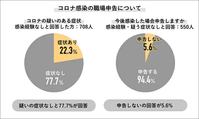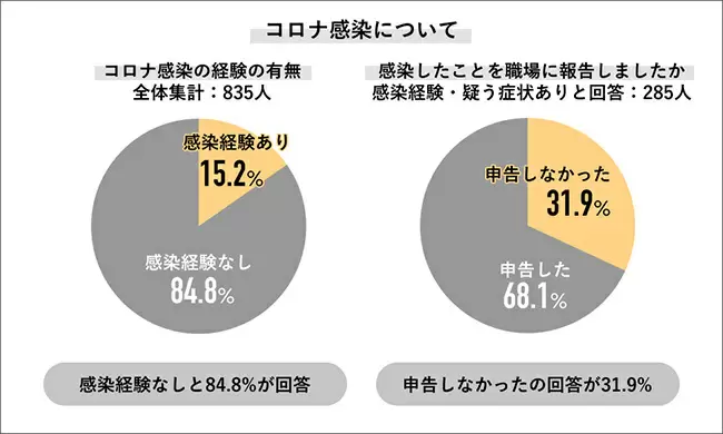 調査対象者のうち、過去に新型コロナへの感染経験があるのは15.2%(208人)で、うち「感染を職場へ申告しなかった」と答えた人は31.9%だった。また、感染経験のない人のうち、新型コロナへの感染の“疑いがある症状”を起こしたことがあると回答した人は22.3%に達している。