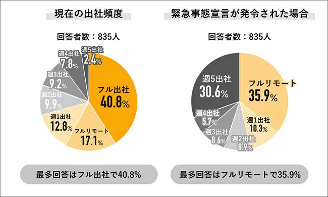 今後、緊急事態宣言が発令された場合の働き方について尋ねた質問では、「フルリモート」が35.9%と現状から約2割程度増加することが明らかになった。