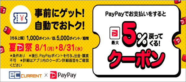 ストリームは、同社が運営しているインターネット通販サイト「ECカレント」と「イーベスト」で、PayPayが提供する決済サービス「PayPay(オンライン決済)」の利用で購入金額の最大5%戻ってくるお得なPayPayクーポン キャンペーンを8月31日まで開催する。