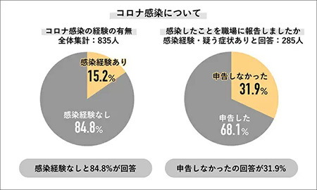 調査対象者のうち、過去に新型コロナへの感染経験があるのは15.2%(208人)。そのうち「感染を職場へ申告しなかった」との回答は31.9%だった。また、感染経験のない人のうち、新型コロナへの感染の“疑いがある症状”を起こしたことがあるとの回答した人は22.3%に達している。