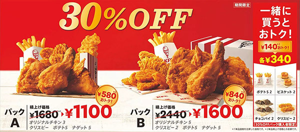 30%OFFパックは、オリジナルチキンと人気のサイドメニューの組み合わせを積み上げ価格から30%オフで楽しめる。オリジナルチキン3個、カーネルクリスピー1個、ナゲット5個、ポテト(S)で1100円(積上げ価格は1680円)の「30%OFFパックA」、オリジナルチキン5個、カーネルクリスピー2個、ナゲット5個、ポテト(S)で1600円(同2440円)の「30%OFFパックB」を用意している。