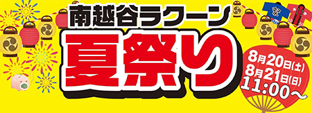 屋台では、ストラックアウト、スーパーボールすくい、輪投げなどで子どもや大人も楽しめる。また、かき氷や綿あめなどのフードを販売する屋台も多い。開催時間は、2日間ともに11時から17時まで。南越谷ラクーンテナント利用のレシートもしくは南越谷ラクーン内の各テナント会員証の提示で、1人1回無料で参加できる。また、レシートや会員証がなくても、1人1回100円で参加が可能だ。