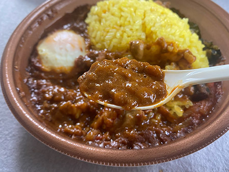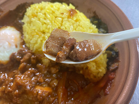 甘辛くて香辛料が効いた魯肉飯の具材もナイス。カレーにちょっと飽きてきたら、魯肉飯の具材で味変して、ずっと新鮮な味わいが楽しめる。チキンの存在感もなかなか。全体のボリュームもいうことない。ここで、自分的にとっておいた目玉焼きを割って、トローリな黄身とルーを混ぜようとして、思わず「柔らかそうな色ながらカッチカッチなんかーい!」とつぶやいてしまった。「キミとはやってられへんわー」とも。他は文句ない。