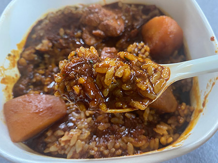 次は、銀座デリーが監修した「カシミールカレー」(同594円)。ルーがただならないくらい真っ黒で、怪しい光を纏っている。構造はセブン‐イレブンのカレーによくある二段重ねで、チンした後に下のご飯にルーをかけると完成。というわけで、ルーが入っている上の容器を持ち上げると、ほぼスープレベルのシャバシャバなルーが一気にご飯に流れ込んだ。ここをミスると、部屋中がスパイシーなことになるので要注意。