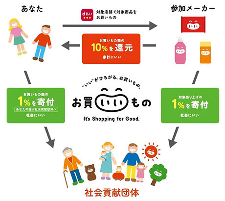 9月1日から対象店舗で花王もしくはネスレの対象商品を合わせて1000円以上をd払い(コード決済)で購入すると、お買いもの額の1%が購入者の選ぶ社会貢献団体に寄付される。公式サイトの寄付先選択ページで自身が応援したい社会(寄付先)を五つのテーマから選ぶことができる。また、購入者にも最大10%がdポイント(期間・用途限定)として後日進呈される。