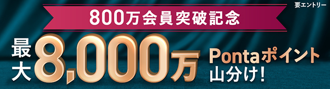 今回の「800万会員突破記念キャンペーン」では、9月1日から10月31日までの期間中に、同キャンペーンにエントリーのうえ、「au PAY カード」「au PAY ゴールドカード」を2万円以上利用すると、キャンペーンに参加した人数に応じて、最大8000万Pontaポイントを山分けして還元する。参加者が増えるほど山分けポイント数が増える。