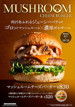 3年連続5回目の登場となるマッシュルームチーズバーガーは、レギュラーパティの2倍以上のボリュームとなる肉汁あふれるジューシーなプレミアムパティを使用し、鉄板の上で温めたとろける濃厚チーズをのせた。ゴロッと生マッシュルームは香りと歯応えが同時に味わえるように軽く表面を焼いて、芳醇なイタリア産ポルチーニクリームソースかけた、いわば「秋を五感で食す」豪快ハンバーガーとなっている。ふんわりゴマバンズでサンドし、香ばしいゴマの香りをプラスした。