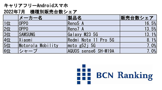 BCNランキングによると、上半期に最も売れたキャリアフリーAndroidスマホは、モノクロカメラを含む4つのカメラを搭載したOPPOの「OPPO Reno5 A」だった。同じOPPOの「OPPO A73」もランキングトップ5に入った。上半期後の7月の動きをみると、ロングセラーの「OPPO Reno5 A」に続き、約6.4インチの有機ELディスプレイ、最大4800万画素のトリプルカメラを搭載した6月23日発売の新製品「OPPO Reno7 A」が2位を獲得。後はこの Reno7 Aが主力機種となりそうだ。