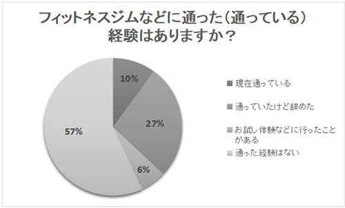 フィットネスジムなどに通った(通っている)経験があるかを尋ねた質問では、「通った経験はない」(57%)が最多となり、以下「通っていたけど辞めた」(27%)が続いている。