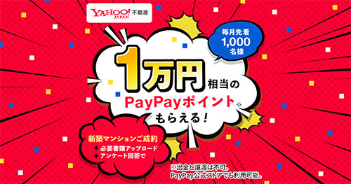 ヤフーは、ユーザーが不動産ポータルサイト「Yahoo!不動産」で対象物件となる新築マンションの資料請求や見学予約をした後に成約、必要書類アップロードとアンケートに回答すると1万円相当のPayPayポイントをプレゼントする取り組みを、10月4日に開始することを予定している。