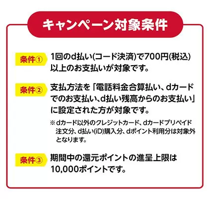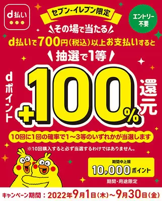 エントリーの上、d払いで1会計あたり700円以上支払うと即時に抽選を行い、当選者には、キャンペーンポイントとして決済額に応じたdポイント(期間・用途限定)を進呈する。当選ポイント数は、1等が全額還元(上限1万ポイント)、2等は10%、3等は1%。当選確率は10回に1回。