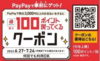 しまむらグループ各店舗で、キャッシュレス決済サービス「PayPay」を利用して3000円以上を決済することで最大100円相当のPayPayポイントがもらえる。クーポンは、PayPayアプリから決済前に事前取得する必要があるほか、「ファッションセンターしまむら」「アベイル」「バースデイ」「シャンブル」「ディバロ」ごとの発行で、それぞれ期間中1回まで利用が可能。オンラインストアの事前決済は、クーポンの適用対象外となる。