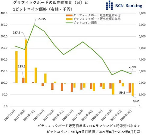グラフィックボード市場が大幅な前年割れに直面している。8月の販売前年比は台数が59.5%と4割減。金額に至っては45.2%と半減以上だ。暗号資産の代表格、ビットコインの価格が昨年秋のピークから6割の大幅下落を記録。ひと相場終わったことでグラフィックボード特需も終息した格好だ。全国2300店舗の家電量販店やネットショップの実売動向を集計するBCNランキングで明らかになった。