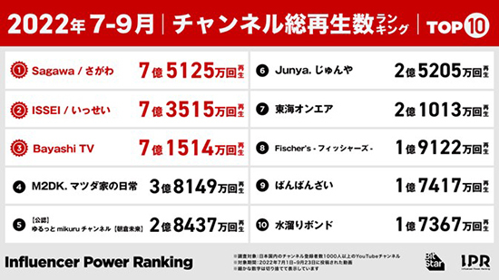 BitStarは、独自の分析ツール「IPR(インフルエンサーパワーランキング)」のデータに基づき、7~9月に活躍した動画クリエイターや動画チャンネルのランキングを発表した。